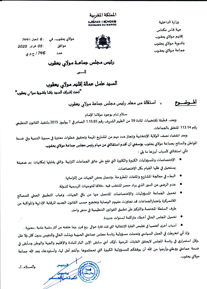 وبحسب ذات المراسلة، فقد أشار الرئيس المستقيل والمنتمي لحزب الحركة الشعبية إلى أن قرار الاستقالة من مهامه جاء "بعد انقضاء نصف الولاية الانتخابية، وإنجاز عدد مهم من المشاريع وتحقيق خطوات معتبرة في مسيرة التنمية وفي خدمة المواطن والسائح بجماعة مولاي يعقوب"