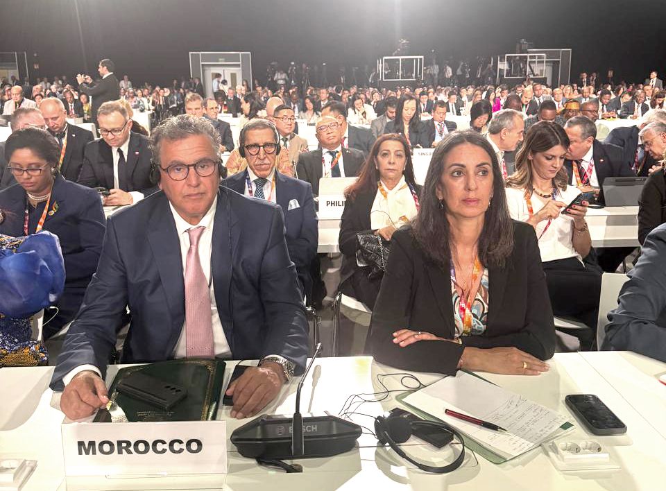 ويضم الوفد المغربي، على الخصوص، وزيرة الاقتصاد والمالية، نادية فتاح، والسفير الممثل الدائم للمملكة لدى الأمم المتحدة، عمر هلال، وسفيرة المغرب بإسبانيا، كريمة بنيعيش.