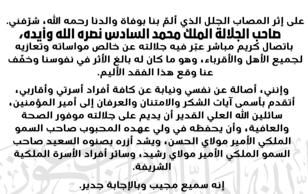 وأكد رباح، من خلال تدوينة نشرها على حسابه الرسمي، أن "صاحب الجلالة الملك محمد السادس نصره الله وأيده شرفني باتصال كريم مباشر، عبر فيه عن خالص مواساته وتعازيه لجميع الأهل والأقرباء، وهو ما خفف عنا وقع هذا الفقد الأليم".
