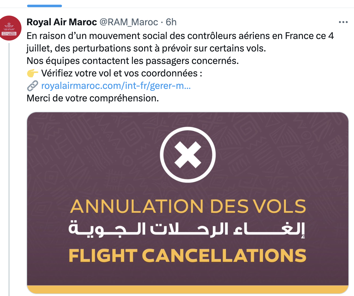 وأكدت الشركة، في بلاغ مقتضب نشرته عبر حسابها الرسمي بموقع "إكس"، أن هذا الإضراب سيؤثر على سير بعض الرحلات المرتبطة بالمجال الجوي الفرنسي، ما سيترتب عنه تغييرات محتملة في مواعيد الإقلاع والوصول.