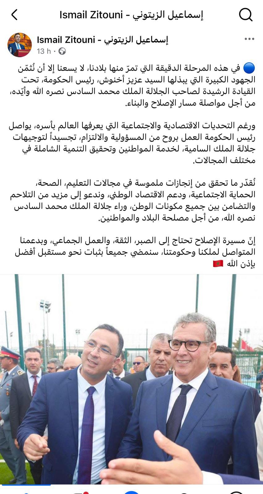 وأضاف البرلماني المنتمي لحزب التجمع الوطني للأحرار: "... رغم التحديات الاقتصادية والاجتماعية التي يعرفها العالم بأسره، يواصل رئيس الحكومة العمل بروح من المسؤولية والالتزام، تجسيداً لتوجيهات جلالة الملك السامية، لخدمة المواطنين وتحقيق التنمية الشاملة في مختلف المجالات".