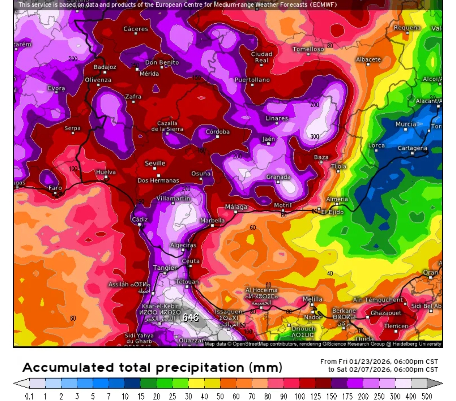 أفادت تقارير جوية مستندة إلى النموذج الأوروبي (ECMWF) بتوقعات غير مسبوقة تهم شمال المملكة، حيث من المرتقب أن تشهد المناطق الشمالية تراكمات مطرية "قياسية" قد تتجاوز 600 ملم في ظرف أسبوعين فقط.
