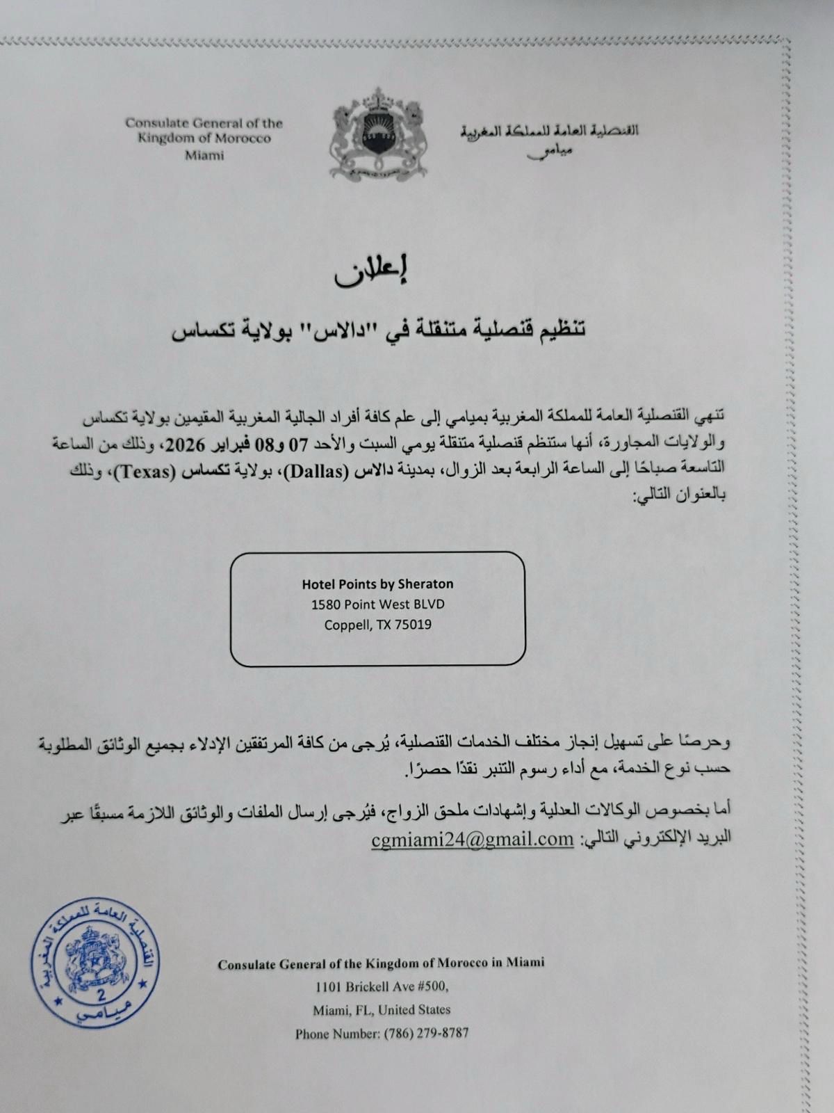 في خطوة تروم تقريب الإدارة من المواطنين المغاربة المقيمين بالولايات المتحدة، أعلنت القنصلية العامة للمملكة المغربية بميامي عن تنظيم قنصلية متنقلة بمدينة دالاس بولاية تكساس، وذلك يومي السبت والأحد 7 و8 فبراير 2026، لفائدة أفراد الجالية المغربية المقيمة بتكساس وعدد من الولايات المجاورة.