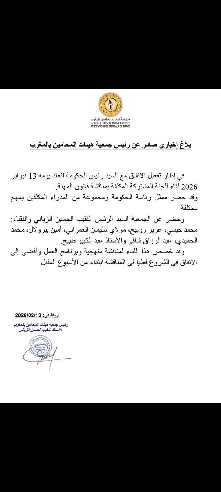 في إطار تفعيل الاتفاق مع رئيس الحكومة انعقد يومه 13 فبراير 2026 لقاء للجنة المشتركة المكلفة بمناقشة قانون المهنة.