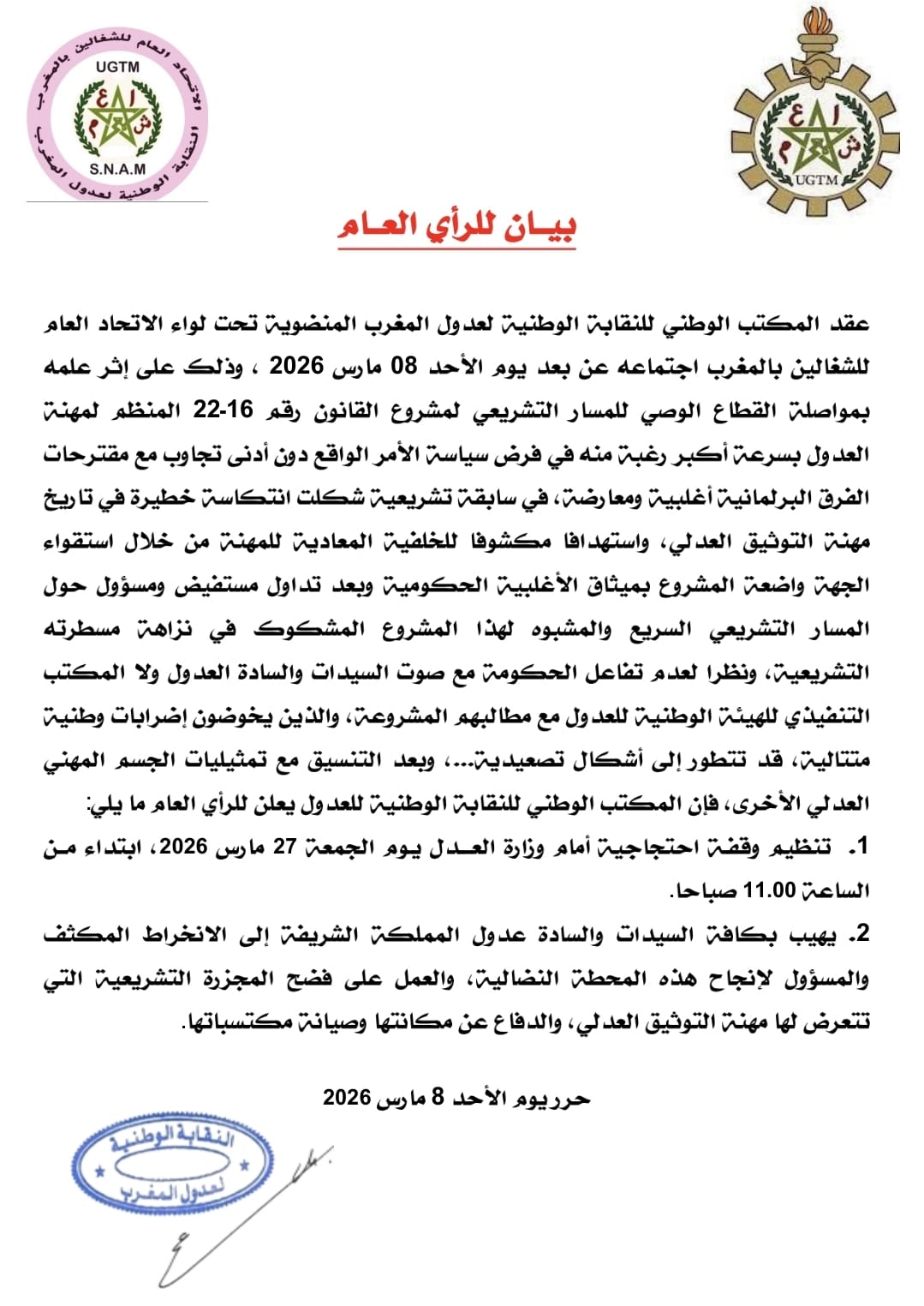 ودعت النقابة كافة السيدات والسادة عدول المملكة إلى الانخراط المكثف والمسؤول في هذه المحطة النضالية، دفاعا عن مكانة مهنة التوثيق العدلي وصيانة مكتسباتها، مع العمل على لفت الانتباه إلى ما اعتبرته “مجزرة تشريعية” تستهدف المهنة.