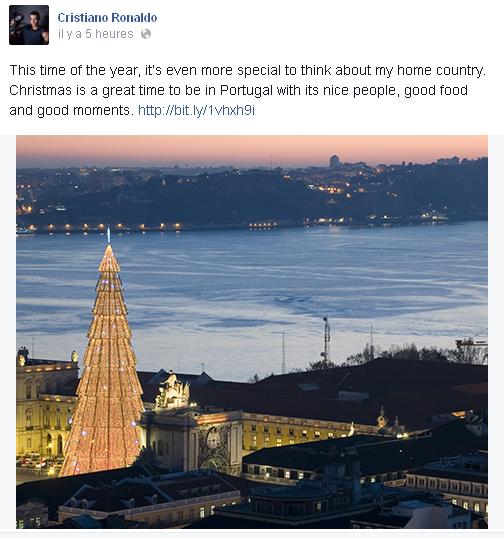 فقد نشر رونالدو على صفحته الفايسبوكية ما يلي:” في هذا الوقت من السنة، لا يوجد أحلى من التواجد في موطني (البرتغال).. (الكريماس) هو أفضل وقت للتوجه إلى البرتغال وقضاء أمتع الأوقات رفقة أشخاص طيبين، طعام جيد وأوقات ممتعة..”.