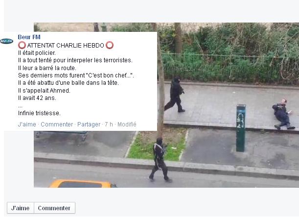 فقد تناقلت مجموعة من وسائل الإعلام الفرنسية خبرا مفاده أن الشرطي الضحية ذو 42 سنة اسمه أحمد وهو مسلم الديانة.