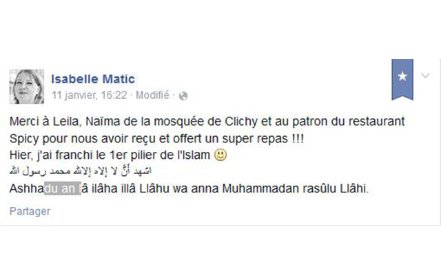 وقالت: «بدأت في تطبيق أولى لأركان الإسلام، أشهد ألا إله إلا الله وأن محمدا رسول الله».