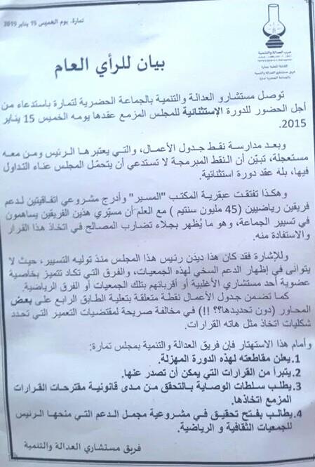 لأجل كل ذلك فقد تبرأ مستشارو حزب المصباح من قرار صادر عن هذه الدورة التي وصفوها بالمهزلة ، مطالبين في ذات الاوان سلطات الوصاية بضرورة فتح تحقيق في هذه النقاط التي كانت محط احتجاج جمعيات أخرى رفعت شعار الاقصاء و حرمانها من حقها في الدعم .