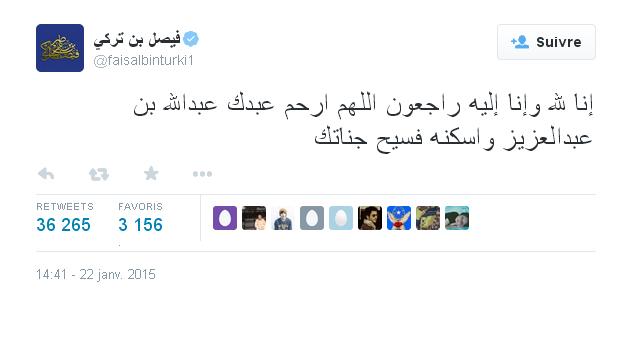 و نعى عدد من الأمراء والدعاة السعوديين الملك الراحل، حيث كتب الأمير فيصل بن تركي على حسابه بـ"تويتر: "إنا لله وإنا إليه راجعون اللهم ارحم عبدك عبدالله بن عبدالعزيز واسكنه فسيح جناتك".