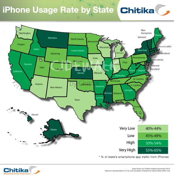 وأجرت شركة "شيتيكا-Chitika" مسحاً داخل الولايات المتحدة الأمريكية وبالأخص الجامعات، وجد أن الجامعيين الذين يتمتعون بأداء أفضل في الدارسة، هم الذين يميلون إلى اقتناء هواتف أبل الذكية أكثر من ميلهم لشراء هواتف أندرويد.