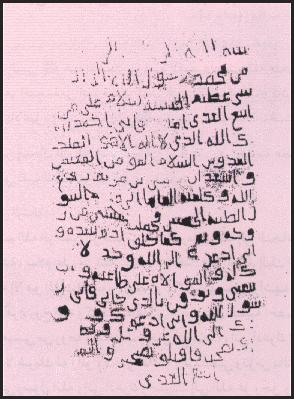(بسم الله الرحمن الرحيم، من محمد رسول الله إلى النجاشي عظيم الحبشة، سلام على من اتبع الهدى، أما بعد، فإن أحمد إليك الله الذي لا إله إلا هو الملك القدوس السلام المؤمن المهيمن، وأشهد أن عيسى ابن مريم روح الله وكلمته ألقاها إلى مريم البتول الطية الحصينة فحملت بعيسى من روجه ونفخه كما خلق آدم بيده، وإني أدعوك إلى الله وحده لا شريك له والموالاة على طاعته وأن تتبعني وتؤمن بالذي جاءني، فإني رسول الله، وإني أدعوك وجنودك إلى الله عز وجل، وقد بلغت ونصحت فاقبل نصيحتي، والسلام على من اتبع الهدي).