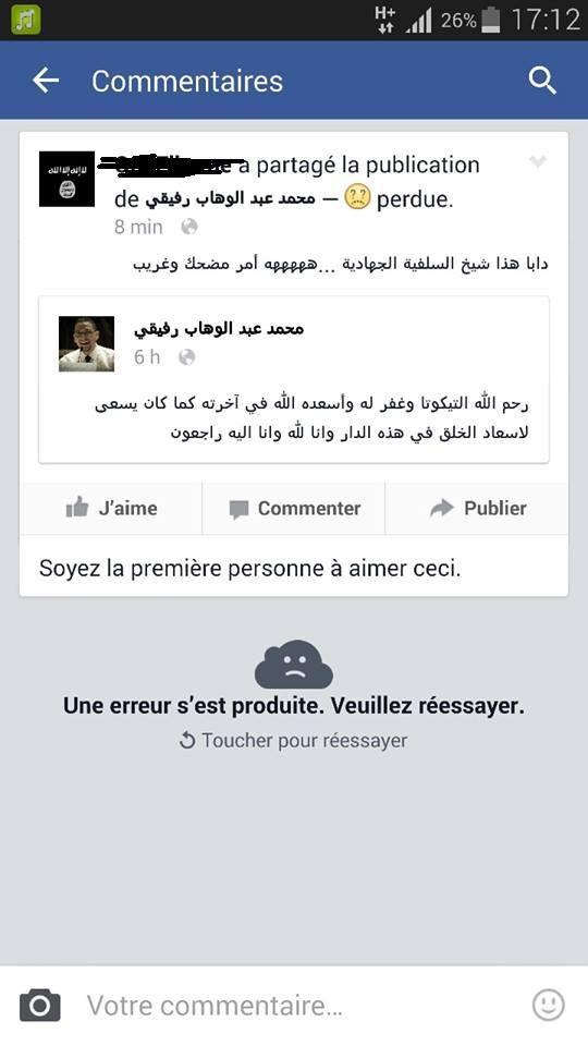 في سلوك غير مفهوم و غير مبرر شرعا و عرفا و إنسانيا ، تهجمت سيدة تضع على بروفيلها بالفيسبوك علم تنظيم الدولة الاسلامية " داعش " على محمد عبد الوهاب رفيقي شيخ السلفية المعروف باسم " أبو حفص " و عقبت على ترحمه على الفنان الكوميدي الراحل هشام " تيكوتا " قائلة : " دابا هذا شيخ السلفية الجهادية ... ههههه أمر مضحك و غريب "، الامر الذي اجبر أبو حفص على الرد عليها لكن بشكل راق و متزن، حيت قال : " دابا هاذ السيدة مسكينة لي دايرا ديك الراية ف البروفايل مستغربة انني تنترحم على السيد لي توفاه الله تعالى... مفهمتش زعما واش حرام ولا بدعة نترحمو عليه ونستغفرو ليه ونطلبو ليه الجنة ولا من شروط السلفية الجهادية انني نلعنو ونقول : الى جهنم وبئس المصير.... وبيني وبينك را كاين ف الغلط ف العنوان انا لاني شيخ لا للسلفية ولا للجهادية.... لا حول ولا قوة الا بالله.. حتى الموت لا وقار لها عند بعض الناس.... رحم الله التكوتا وغفر له ورزقه الفردوس الأعلى وحشره مع النبيين والصديقين والشهداء والصالحين... ايوا اش بان ليك دابا؟ " ... انتهى كلام أبو حفص ... لكن حتى أنتم أعزائي القراء : اش بان ليكم في هاد السيدة و في جواب ابو حفص ؟