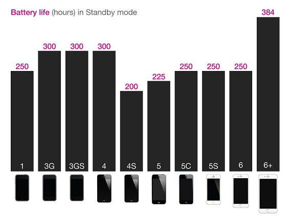 أورد موقع "بيزنس إنسايدر" التقني رسماً بيانياً يبرز مراحل تطور البطارية وعمرها ومدى استمراريتها بالساعات في وضعية "الاستعداد"، والذي يوضح جلياً أن أبل منذ طرحها أول آي فون مروراً بـ"آي فون ثري جي" و"آي فون 5 إس" وحتى الإصدارين الجديدين "آي فون 6" و"6 بلس" لم يتحسن عمر البطارية إلا بالقدر الضئيل غير الملموس، كما هو موضح في الرسم البياني أدناه.