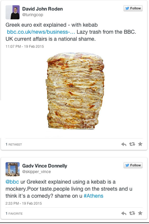 وأثار هذا التقرير انتقادات لاذعة وسخرية عارمة على شبكات التواصل الاجتماعي لاسيما تويتر الذي شهد كثافة في التعليقات المتعلقة بهذا الأمر، إذ رأى المغردون أن استخدام "سيخ كباب" والذي يعد من الأكلات الشعبية في دول البحر المتوسط ومن ضمنها اليونان أمراً يثير السخرية وأسلوب "بائس ومخز" لشرح الأزمة الراهنة.