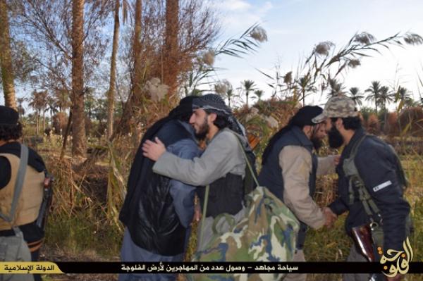 وتظهر الصور التي نشرها إعلام ولاية الفلوجة، عدداً من المقاتلين الذين يصافحون عناصر من التنظيم، فيما لم يكشف التقرير عن الجهات التي قدم منها المقاتلون، وتظهر صورة أخرى مائدة طعام فارهة أعدها التنظيم لاستقبال الإرهابيين.