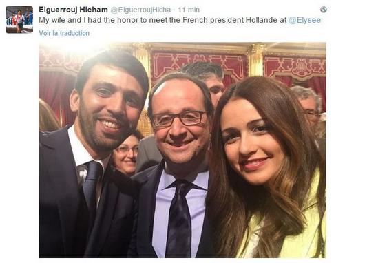 نشر البطل العالمي السابق هشام الكروج، صورة على صفحته الرسمية بموقع التواصل "تويتر"، بمعية زوجته والرئيس الفرنسي فرانسوا هولاند بقصر الإيليزي بباريس.