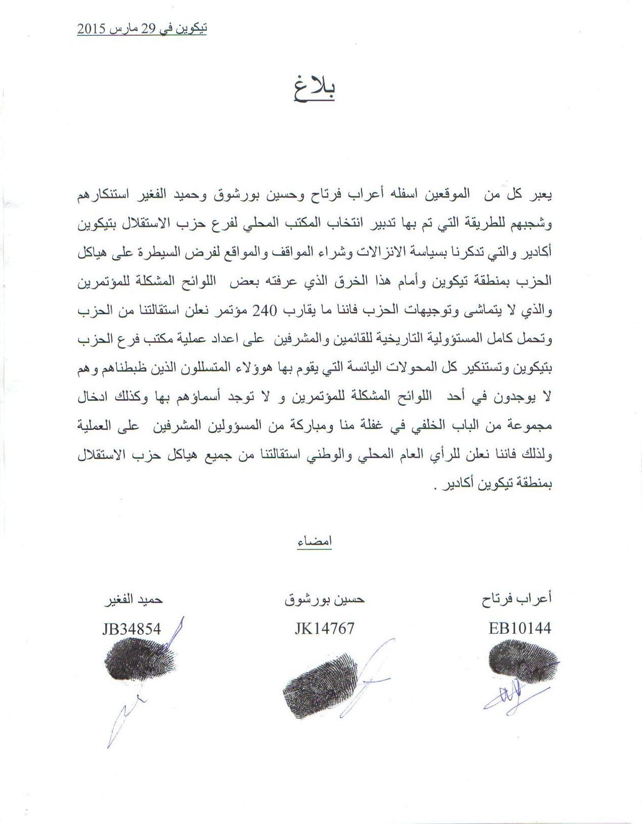 ففي بلاغ موقع من ثلاثة أعضاء في الحزب، ويتعلق الأمر بكل من أعراب فرتاح وحسين بورشوق وحميد الفغير، عبر هؤلاء عن استنكارهم وشجبهم للطريقة التي تم بها تدبير انتخاب المكتب المحلي لفرع حزب الاستقلال بتيكوين أكادير، والتي تذكر، حسب نص البلاغ، بسياسة الإنزالات وشراء المواقف والمواقع لفرض السيطرة على هياكل الحزب بمنطقة تيكوين.