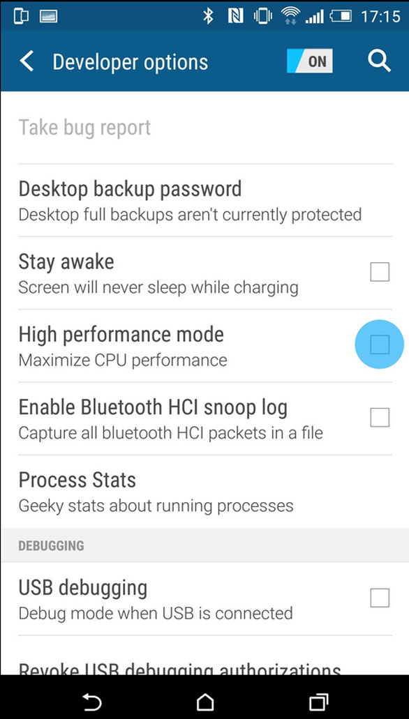 بالذهاب إلى "اعدادات" ثم "حول" ثم "معلومات البرنامج" ثم "المزيد" ثم "Developer options"، يوجد بأسفله خيار "وضعية أعلى أداء" والذي يجعل معالج "سناب دراغون 810" في الهاتف يعمل بأعلى مستوى وأداء له، لكنه يقلص عمر البطارية.