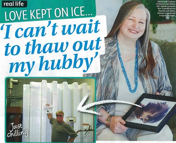 قررت سيدة أمريكية تجميد جثتها بعد وفاتها لتتمكن من الاجتماع بزوجها الذي توفي عام 1994 ولا تزال جثته منذ ذلك الوقت مجمدة بمعهد كرايونيكس في ديترويت مقابل 200 ألف دولار.