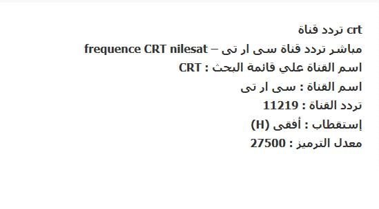 تردد قناة CRT المفتوحة على القمر الصناعي نايل سات، هو 11219، وذلك على إستقطاب أفقي