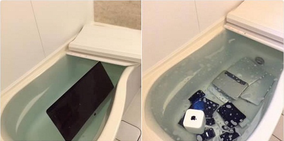 لم تجد امرأة غيورة وسيلة للانتقام من حبيبها الخائن سوى بإغراق مجموعته من أجهزة آبل الإلكترونية في المرحاض. حيث قامت المرأة بعد أن اكتشفت أن حبيبها يواعد فتاة أخرى بجمع كل أجهزته الإلكترونية : جهاز آي باد وهاتفي آي فون وأجهزة حاسب ثم عمدت إلى إتلافها في دورة المياه.