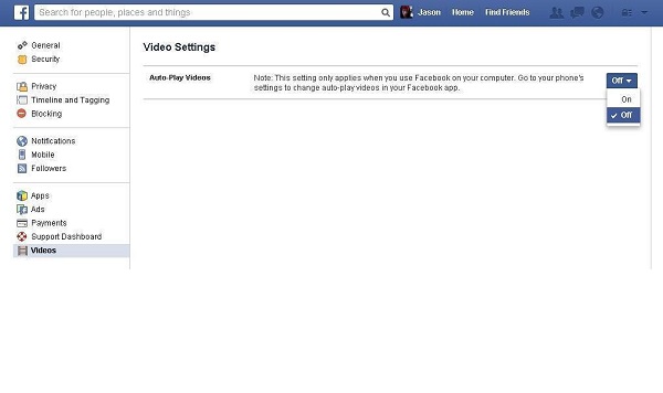 ويتمكن المستخدم من إيقاف وظيفة التشغيل التلقائي لمقاطع الفيديو بكل سهولة من خلال النقر على مفتاح السهم في أعلى الجانب الأيمن من الشاشة بجوار اسم المستخدم، وبعد ذلك يتم اختيار قائمة الإعدادات (Settings)، ثم يتم البحث عن بند "مقاطع الفيديو" (Videos) .