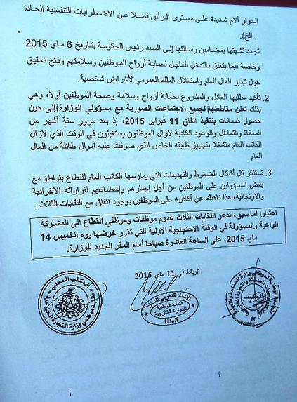 تجدد تشبتها بمضامين رسالتها إلى السيد رئيس الحكومة بتاريخ 6 ماي 2015 وخاصة فيما يتعلق بالتدخل العاجل لحماية أرواح الموظفين وسلامتهم وفتح تحقيق حول تبذير المال العام واستغلال الملك العمومي لأغراض شخصية.