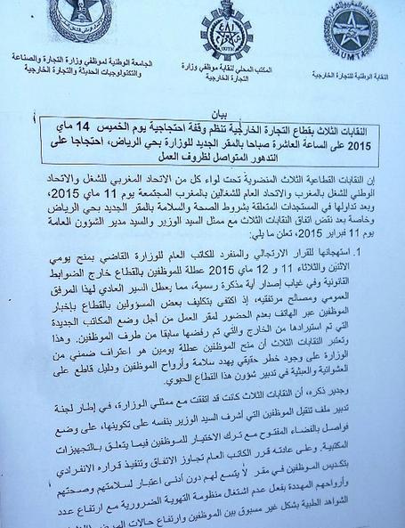و أكدت النقابات القطاعية الثلاث المنضوية تحت لواء كل من الاتحاد المغربي للشغل والاتحاد الوطني للشغل بالمغرب والاتحاد العام للشغالين بالمغرب المجتمعة يوم 11 ماي 2015، وبعد تداولها في المستجدات المتعلقة بشروط الصحة والسلامة بالمقر الجديد بحي الرياض وخاصة بعد نقض اتفاق النقابات الثلاث مع ممثل السيد الوزير والسيد مدير الشؤون العامة يوم 11 فبراير 2015، تعلن ما يلي: