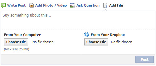 ويمكن مشاركة الملفات بين أكثر من مستخدم من خلال إنشاء مجموعة Group، حيث يوفر فيس بوك بشكل افتراضي خيار إضافة ملف Add File يمكن تحديده من الكمبيوتر أو من حساب المستخدم في دروب بوكس.