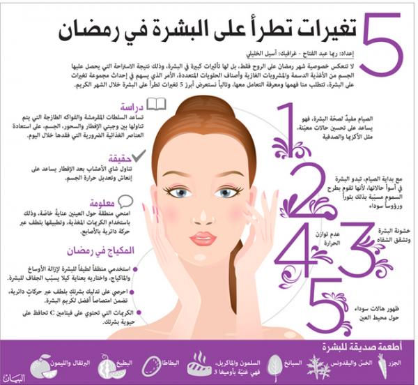 لا تنعكس خصوصية شهر رمضان على الروح فقط، بل لها تأثيرات كبيرة في البشرة، وذلك نتيجة الاستراحة التي يحصل عليها الجسم من الأغذية الدسمة والمشروبات الغازية وأصناف الحلويات المتعددة، الأمر الذي يسهم في إحداث مجموعة تغيرات على البشرة، تتطلب منا فهمها ومعرفة التعامل معها، وتالياً نستعرض أبرز 5 تغيرات تطرأ على البشرة خلال الشهر الكريم.