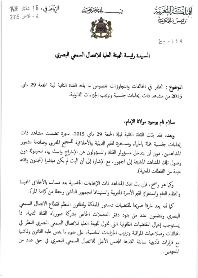 وجه رئيس الحكومة عبد الاله بنكيران، باقتراح من مصطفى الخلفي وزير الاتصال الناطق الرسمي باسم الحكومة، مراسلة إلى رئيسة الهيأة العليا للاتصال السمعي البصري بخصوص ما تم بثه على القناة الثانية ليلة الجمعة 29 ماي 2015 من مشاهد ذات إيحاءات جنسية في سهرة المغنية الامريكية جينفر لوبيز.