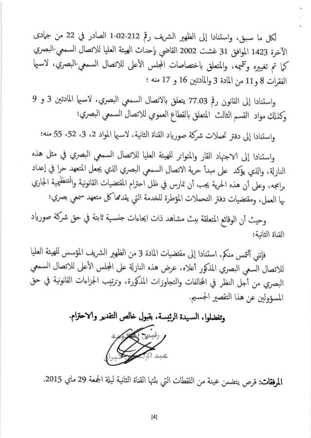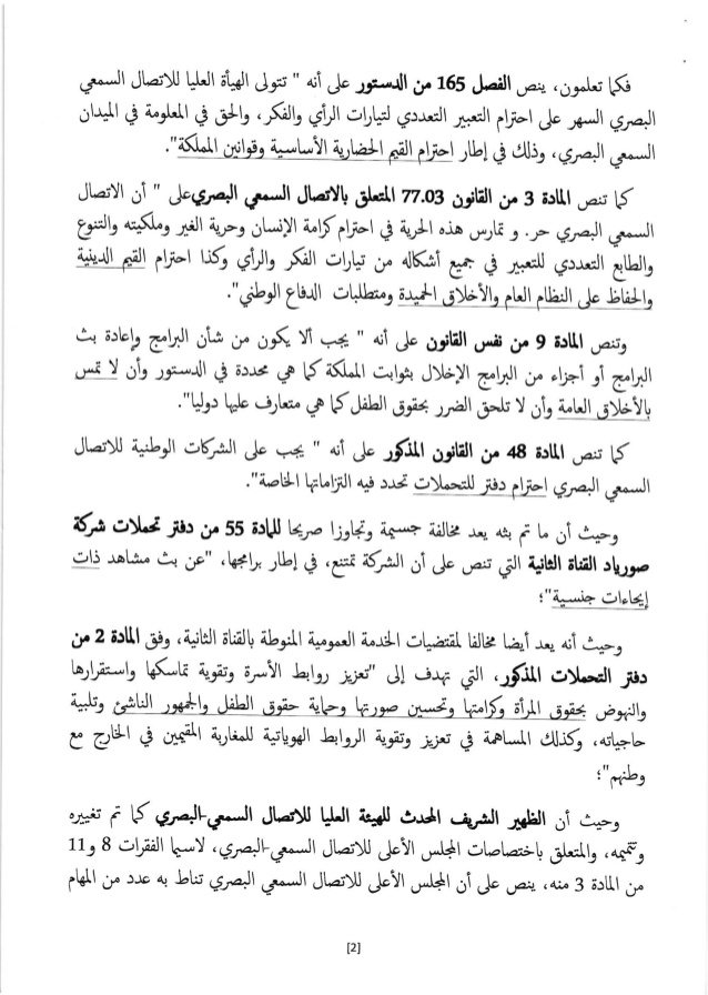 واعتبرت الرسالة التي نشرها وزير الاتصال على صفحته الرسمية بالفايسبوك، أن بث تلك المقاطع مخالف لدستور المملكة خاصة مع مقتضيات الفصل 165، ويعد خرقا للقانون 77.03 المنظم لقطاع الاتصال السمعي البصري ببلادنا وخاصة مع المادة التاسعة، وكذا لمضمون عدد من مواد دفتر التحملات الخاص بشركة صورياد القناة الثانية خاصة المادة 55 ضمن الباب الرابع المخصص للأخلاقيات.