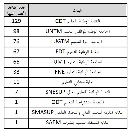 وقد أسفرت هته النتائج على استمرار تمثيلية النقابات التعليمية الخمس: النقابة الوطنية للتعليم (CDT) بـ 129 مقعدا، والجامعة الوطنية لموظفي التعليم (UNTM) بـ 98 مقعدا، والجامعة الحرة للتعليم (UGTM) بـ 76 مقعدا والنقابة الوطنية للتعليم (FDT فاتحي) بـ 67 مقعدا والجامعة الوطنية للتعليم (UMT وFDT عزوزي) بـ 66 مقعدا.