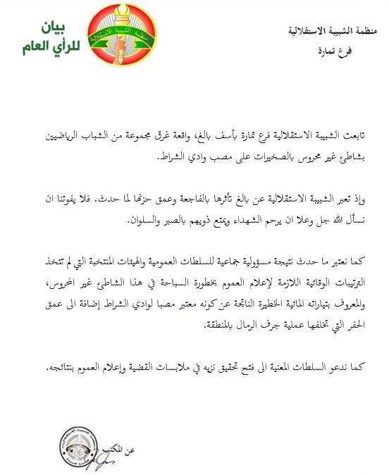 في بيان للرأي العام المحلي و الوطني ، تابعت الشبيبة الاستقلالية فرع تمارة بأسف بالغ ، و حزن شديد واقعة غرق مجموعة من الشباب الرياضيين بشاطئ غير محروس بالصخيرات على مصب وادي الشراط .