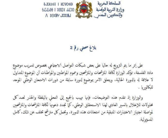 نفت وزارة التربية الوطنية ما يتم الترويج له حاليا على بعض شبكات التواصل الاجتماعي بخصوص تسريب موضوع مادة الفلسفة، و أكدت الوزارة في بلاغ توصل موقع أخبارنا بنسخة منه، لكافة المترشحات والمترشحين وعموم المواطنين والمواطنات أن الموضوع المتداول لا علاقة له بالدورة الحالية، ويتعلق الأمر بموضوع لدورة سابقة من دورات الامتحان الوطني الموحد للبكالوريا .