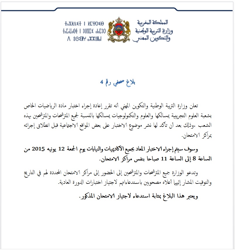 أعلنت وزارة التربية الوطنية والتكوين المهني أنه تقرر إعادة إجراء اختبار مادة الرياضيات الخاص بشعبة العلوم التجريبية بمسالكها والعلوم والتكنولوجيات بمسالكها بالنسبة لجميع المترشحات والمترشحين بهذه الشعب ،وذلك بعد أن تأكد لها نشر موضوع الاختبار على بعض المواقع الاجتماعية قبل انطلاق إجرائه بمراكز الامتحان.