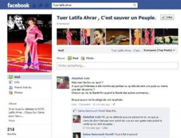 أسس نشطاء على فيس بوك باللغة الفرنسية صفحة حملت عنوان "قتل لطيفة أحرار إنقاذ شعب وتضمنت دعوات لقتل الفنانة المغربية بعد الأزمة التي أثارتها بمهرجان مراكش. تلقت الفنانة المغربية لطيفة أحرار -التي أثارت جدلا بمهرجان مراكش بعد ظهور بقفطان عاري الساقين- تهديدات بالقتل عبر فيس بوك. وأسس نشطاء على فيس بوك باللغة الفرنسية صفحة حملت عنوان "قتل لطيفة أحرار إنقاذ شعبTuer Latifa Ahrar , C’est sauver un Peuple.! " وتضمنت دعوات لقتل الفنانة المغربية بعد الأزمة التي أثارتها بمهرجان مراكش. غير أن زوار الصفحة رفضوا دعوات قتلها، ودعوا من أسسها إلى حذفها. ولم يرد أي تعليق من الفنانة المغربية حول الصفحة. كانت الفنانة المغربية قد دافعت عن ظهورها بقفطان مغربي مع حركة أظهرت سيقانها عارية، بأنها تساير الموضة والأناقة التي تلائم المرأة. ونفت في الوقت نفسه أن يكون ظهورها بهذا الشكل في مهرجان مراكش مؤخرا، ردا على دعوةٍ لها بـ"الهداية" من قبل عبد الإله بن كيران رئيس الحكومة المعين والأمين العام لحزب العدالة والتنمية الإسلامي الفائز في الانتخابات البرلمانية، بحسب هسبريس المغربية. وتعرضت الفنانة المغربية لحملة انتقادات حادة على فيس بوك، إثر تعمدها إظهار ساقيها أمام عدسات المصورين في مهرجان مراكش رغم ارتدائها قفطانا مغربيا طويلا. كان بن كيران قد دعا للفنانة المغربية في مقابلة تلفزيونية بالهداية بعد الجدل الكبير الذي أثاره حزبه إثر عرض مسرحيتها "كفر نعوم"، التي تضمنت مشهدا تظهر فيها وهي تنزع ملابسها، وظهرت بلباس البحر. يذكر أن الفنانة المغربية علّقت على صعود الإسلاميين إلى الحكم، قائلة إنها ليس لديها مشكلة كباقي المغاربة، وتنتظر تطبيق البرامج التي وعد به الحزب في حملته، ومن هذا المنطلق يمكن الحكم عليه لا بغيره. وأضافت أحرار أن المغاربة اختاروا حزب "العدالة والتنمية"، وعلينا احترام اختيارهم كما اختار الإسبان الحزب الشعبي واحترم الكل اختيارهم الديمقراطي. المصدر: mbc.net
