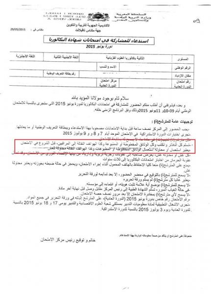 القاضي ب:" تُسلم كل الدفاتر والكتب والوثائق المخطوطة أو المطبوعة وكذا الهواتف النقالة إلى المراقبين قبل الشروع في الامتحان". و"يعتبر استعمال أو محاولة استعمال الوثائق المخطوطة أو المطبوعات وكذا الهواتف النقالة محاولة للغش"