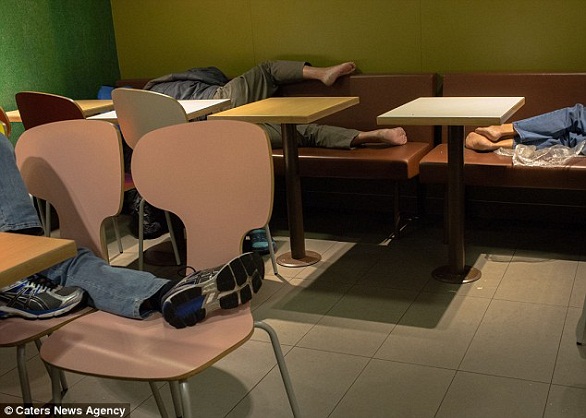 وقال المصور كاترا للصحيفة: "إذا قمت بزيارة أحد فروع ماكدونالدز التي تستقبل زبائنها على مدى 24 ساعة، فمن المحتمل أن تجد المطعم وقد تحول إلى وكر ينام فيه المشردون وخاصة بين الساعة 1.00 بعد منتصف الليل و5.00 صباحا".
