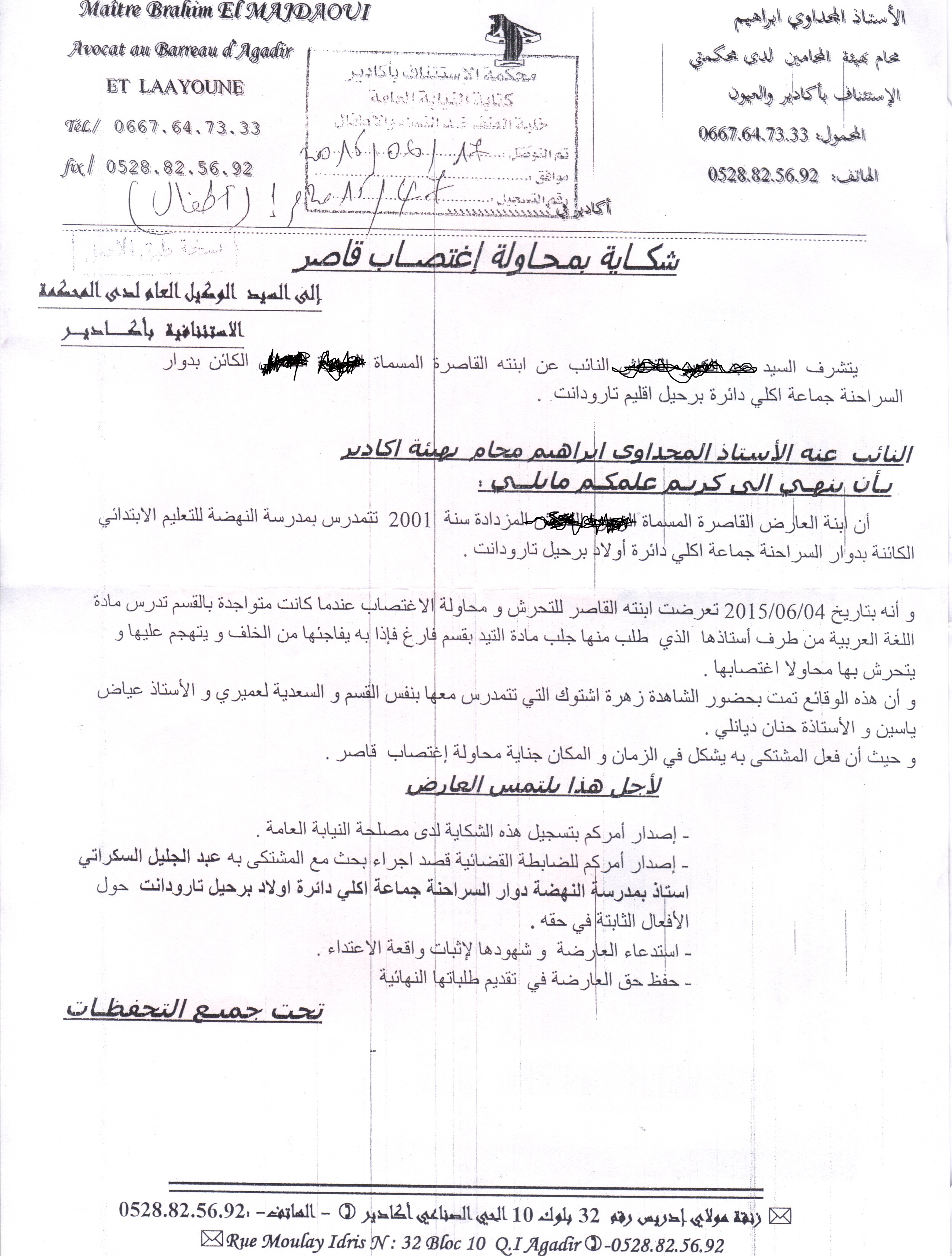 والد الضحية بعد علمه بالأمر تقدم بشكاية بمحاولة الإغتصاب الى الوكيل العام للملك باستئنافية اكادير وذلك صباح يوم الأربعاء 17 يونيو 2015 ليطالب باتخاذ الإجراءات الجزرية اللازمة ضد المتهم الذي لم يراع الأمانة الملقاة على عاتقه وتسبب في ضياع مستقبل ابنته الدراسي.