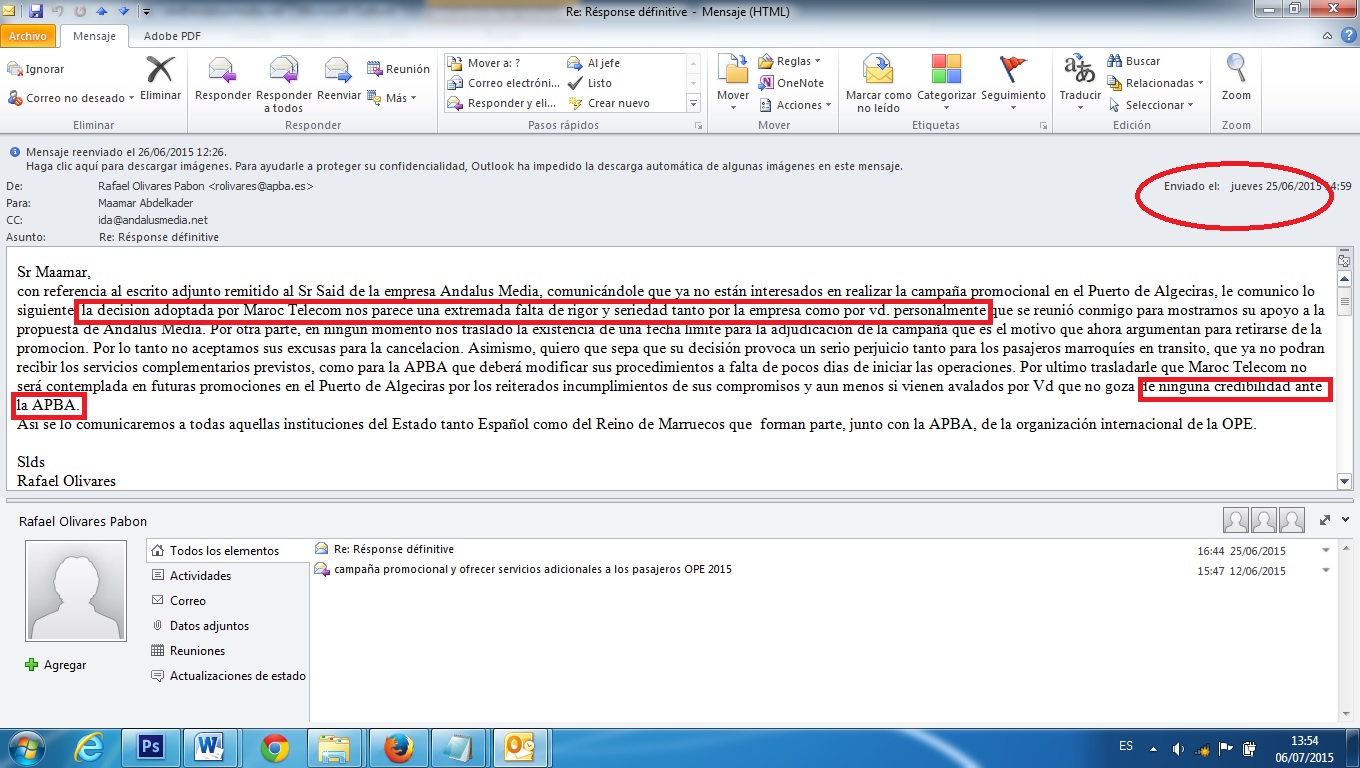 وأكد نائب مدير الميناء رافييل أوليفاريس في رسالته إلى مدير التسويق بشركة اتصالات المغرب عبد القادر معمر أن الشركة المغربية "فقدت كل مصداقية" لدى سلطات الميناء بعد هذه القرار المفاجئ، حيث لن تستطيع هذه الأخيرة تأمين الخدمات الإضافية للمهاجرين المغاربة الذين يعبرون عبر ميناءي الجزيرة الخضراء وطريفة باتجاه المغرب.