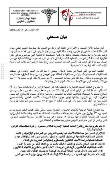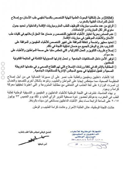 و بهذه المناسبة، نتشرف في اللجنة الوطنية للأطباء الداخليين و المقيمين و التنسيقية الوطنية لطلبة الطب في المغرب، بدعوتكم لحضور ندوة صحفية لتنوير الرأي العام، و ذلك يوم الخميس 23 يوليوز 2015 على الساعة 4 مساء بمقر الأطباء الداخليين بمستشفى ابن سيناء بالرباط.