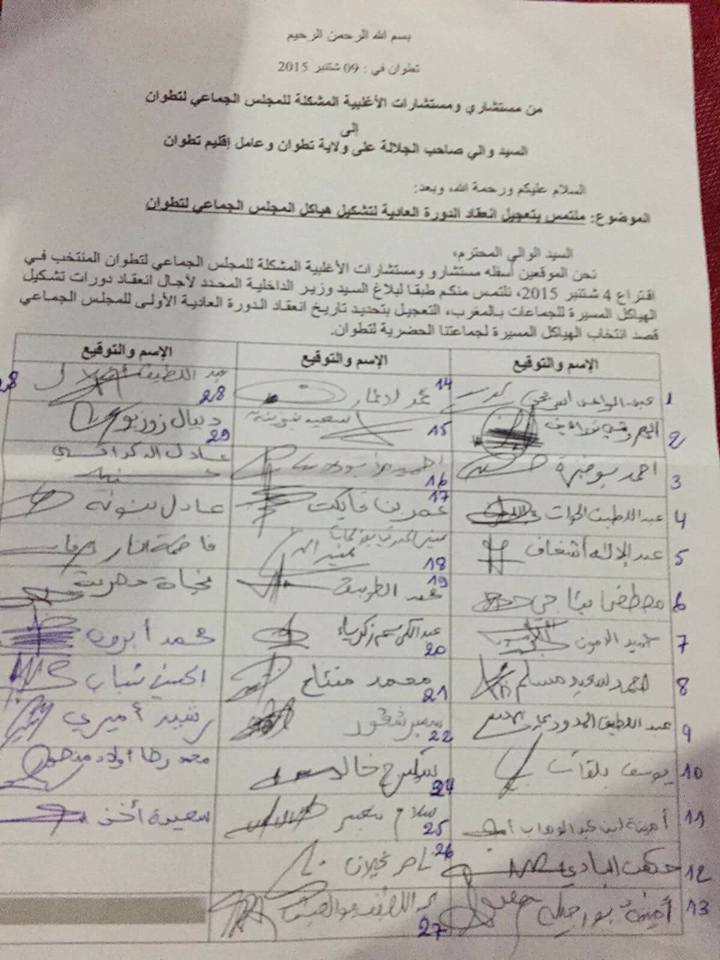 رد فعل أحزاب التحالف المشكلة من طرف حزب العدالة والتنمية و الأصالة والمعاصرة و الاستقلال بتطوان، لم يتأخر اذ تقدمت بملتمس إلى والي ولاية تطوان لعقد الدورة العادية لتشكيل هياكل المجلس الجماعي لتطوان، و تم تداول وثيقة الملتمس التي تتضمن توقيع 38 مستشارا عبر صفحات التواصل الاجتماعي الفايسبوك .