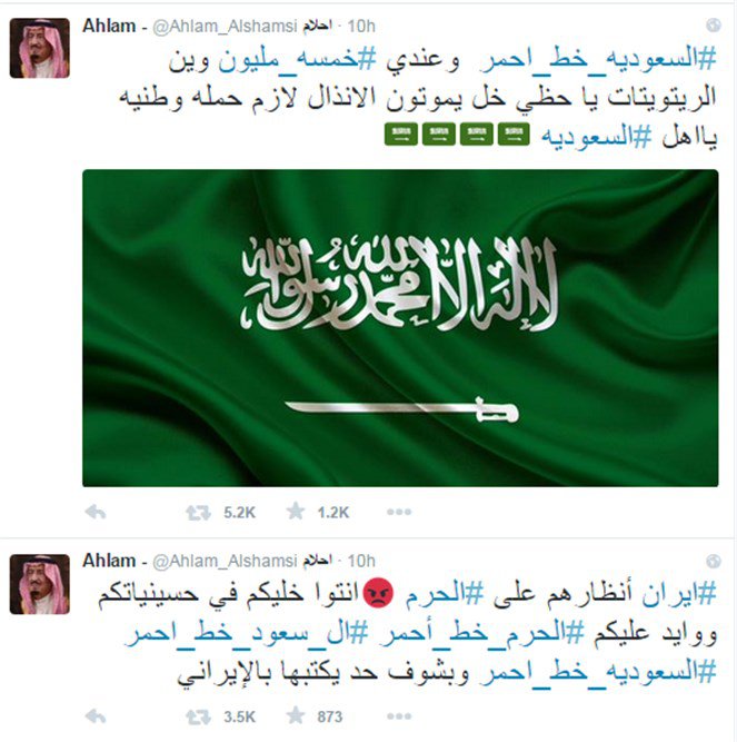 وسريعا انتشار على “تويتر” وسم حمل اسم #احلام_تتطاول_على_الشيعة، بعد أن غردت أحلام على صفحتها الشخصية بالقول “ايران أنظارهم على الحرم.. انتوا خليكم في حسينياتكم ووايد عليكم” أرفقتها بثلاث وسوم أخرى كانت “الحرم خط أحمر.. ال سعود خط أحمر ..السعودية خط أحمر “، ساخرة من الإيرانيين بالقول “بشوف حد يكتبها بالإيراني”.