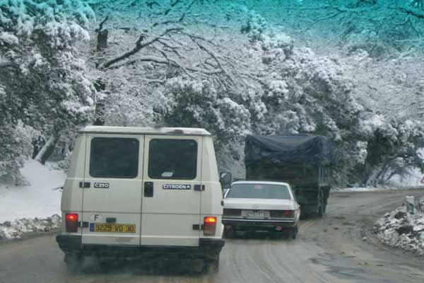 شهود عيان تحدثوا في اتصالات هاتفية بالجريدة، عن طوابير طويلة من الشاحنات والسيارات توقفت لعدة ساعات على جنبات الطريق الوطنية رقم 8، عند جبل هبري، في انتظار إزاحة الثلوج من فوق الطرقات في الساعات الأولى من صباح أول أمس الثلاثاء، كما تحدث بعض المسافرين عن كونهم ظلوا محاصرين وسط الثلوج طوال ليلة الاثنين الثلاثاء، خاصة بنواحي تامحضيت وسيدي عدي وزايدة، من دون أن يتوفر العديد منهم على أغطية ومواد غذائية، في حين لم تشرع آليات إزالة الثلوج في عملها إلا في وقت متأخر.