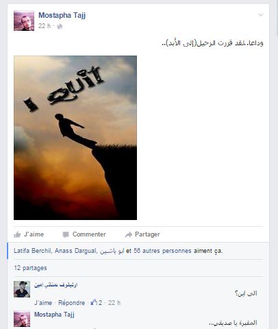 اهتز الحساب الشخصي لطالب طالب جامعي يدعى مصطفى تاج، و ذلك بعدما أوفى بكلامه في تدوينته الأخيرة التي ودع بها أصدقاءه.