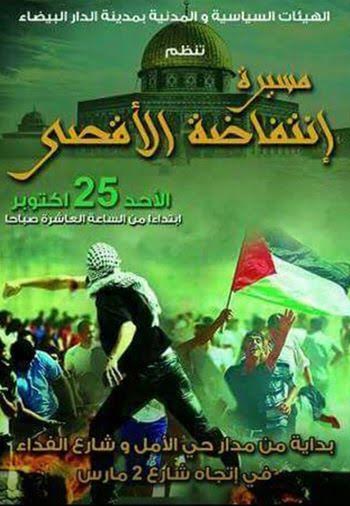 دعت مختلف أطياف المجتمع المغربي، من أحزاب سياسية وهيئات نقابية وفعاليات المجتمع المدني ، الى تنظيم مسيرة حاشدة يوم الاحد المقبل بالدار البيضاء، احتجاجا على العدوان الإسرائيلي على الشعب الفلسطيني تحمل اسم "انتفاضة الأقصى".