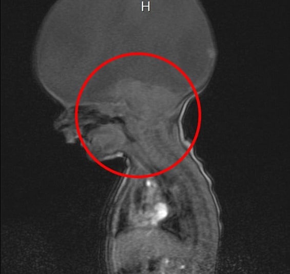 في صورة شعاعية صادمة، يظهر رأس الطفل البريطاني آرون الذي ولد قبل عامين، خالياً تماماً من الدماغ، باستثناء قسم صغير في نهاية العنق، يسمح له فقط بالحركة والتنفس.