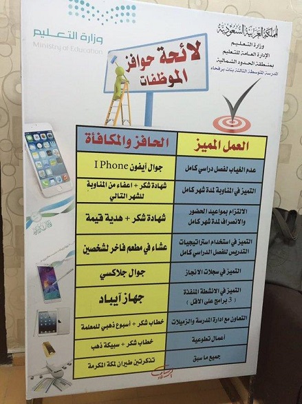 وكانت مديرة المدرسة المتوسطة الثالثة بنات برفحاء بمنطقة الحدود الشمالية قد نشرت لائحة بالجوائز في حال تميزهن في استراتيجيات التدريس وعدم غيابهن وتعاونهن مع إدارة المدرسة، وفقاً لصحيفة عاجل الإلكترونية السعودية.